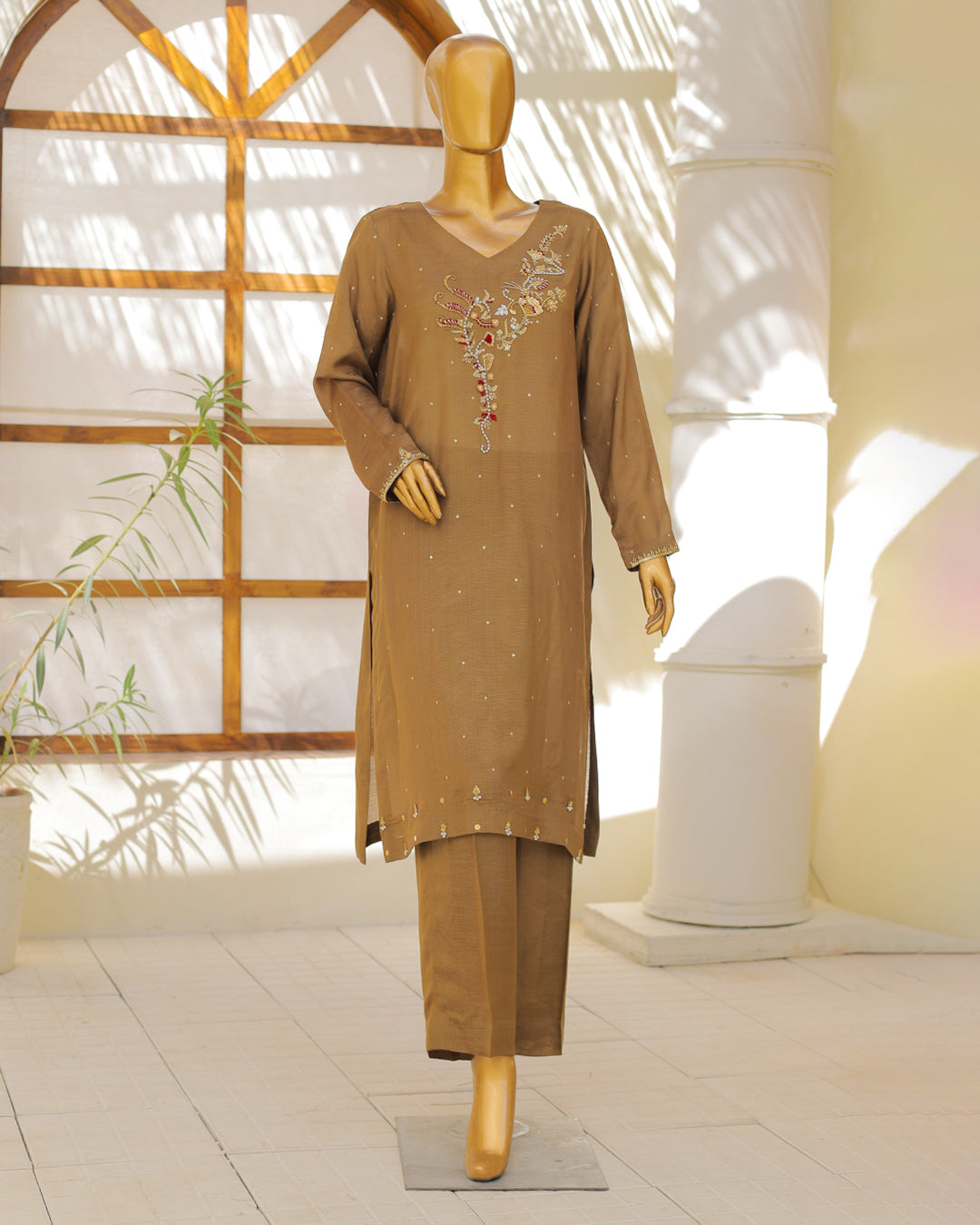 A classy mocha brown outfit with neck embroidered shirt with sequence work, giving a refined yet modern look. Perfect for daytime events and casual gatherings.